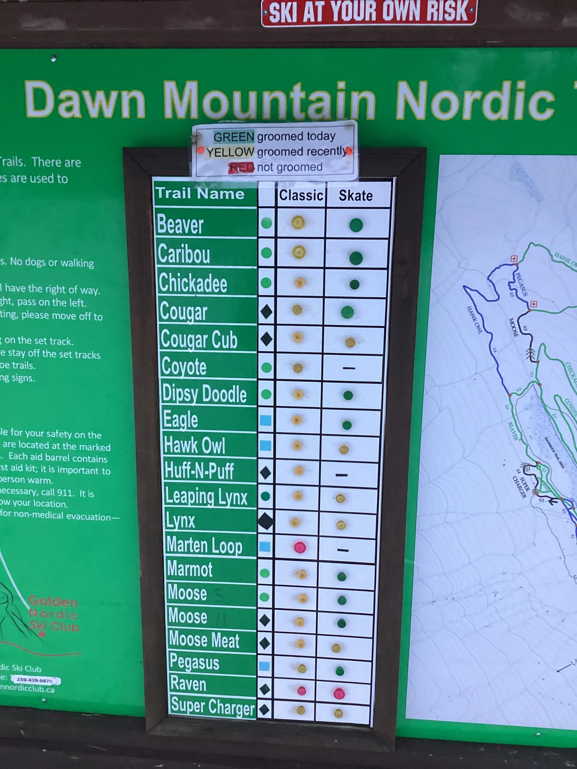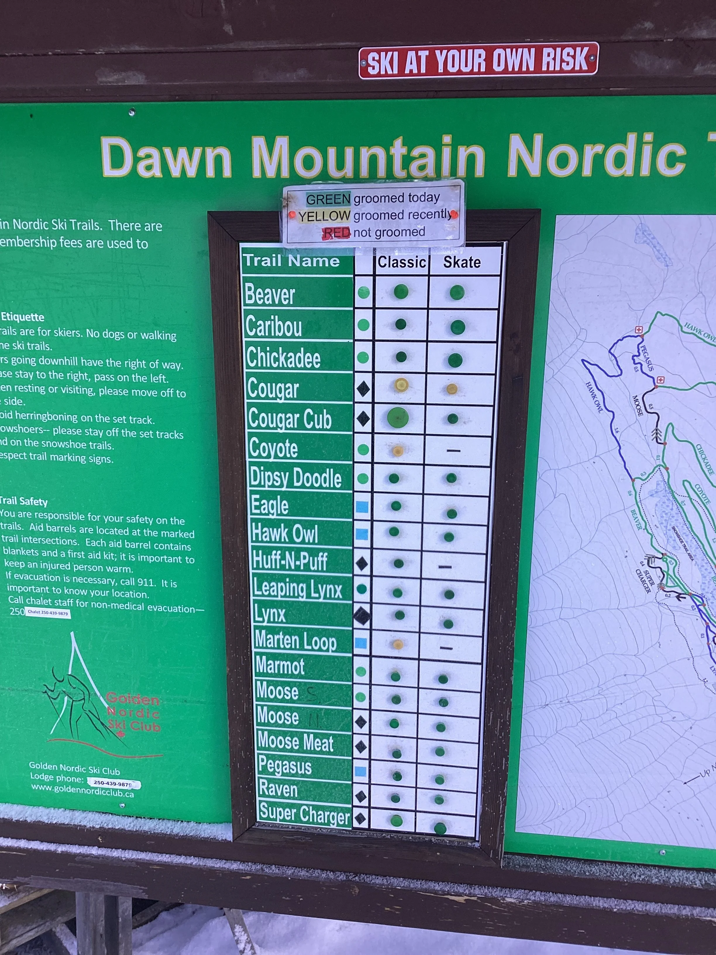Sign in before heading out and pay the required trail fee(included with Golden Nordic Ski Club membership).