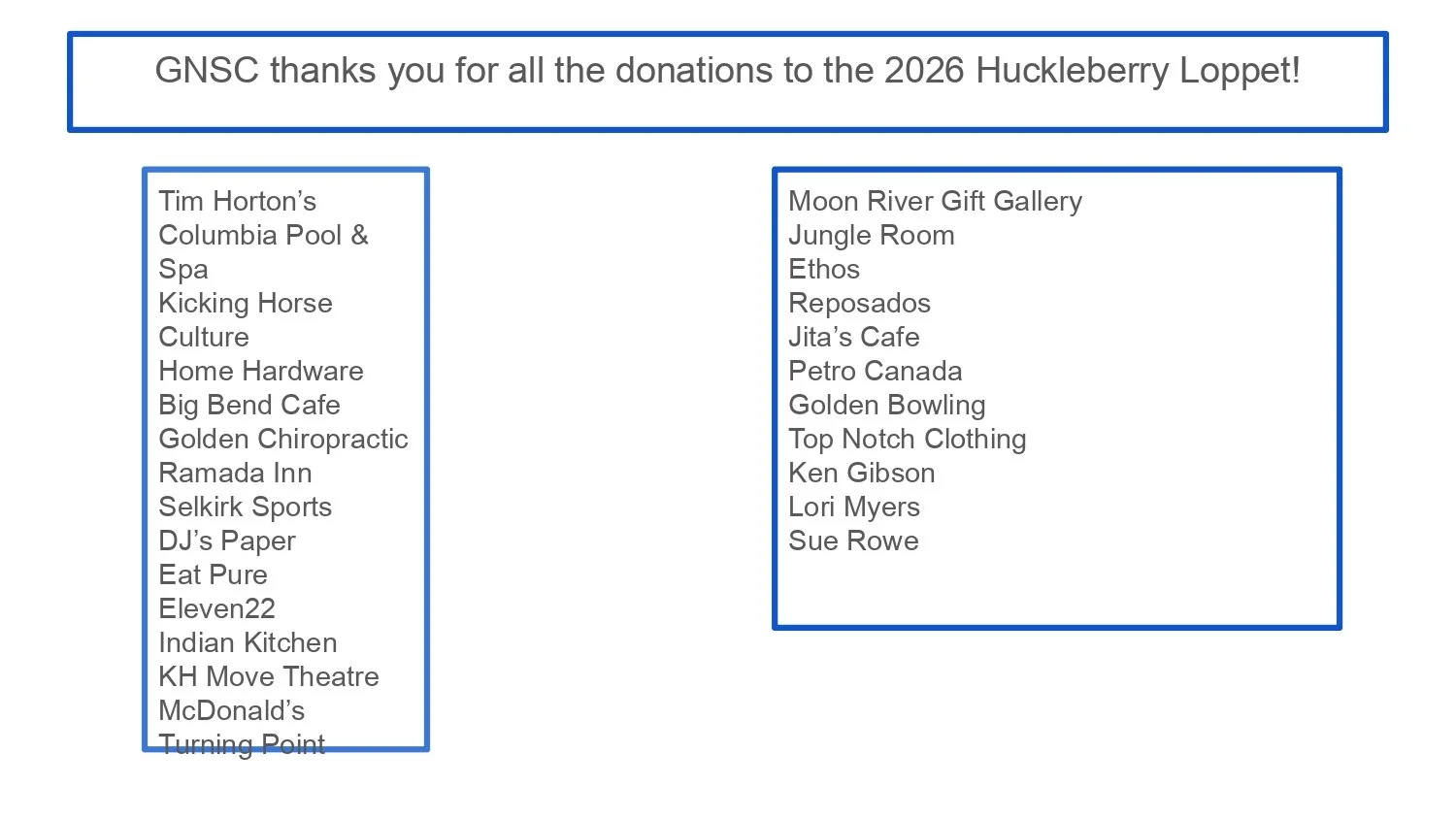 To our wonderful team of volunteers! You guys were awesome this weekend and helped the Huckleberry Loppet run smoothly. It would not be possible without these wonderful people. Apologies if anyone was missed; we know there were so many people helping out this weekend in many ways. Thanks to everyone: Adam Oster, Andrew Caldwell, Annette Boelman, Barb Friedli, Barb Huckvale, Barry Johnson, Bev Schumlach, Brian Timmis, Bruce Bembridge, Bruce Fairley, Bruce McMahon, Carol Jefferies, Cathy Cowles, Cheryl Ross, Chris Gilmour, Christine Bernier, Cindi Brown, Connie Barrett, Dana Faubion, Diane Legg, Donna Gylander, Ed Young, Ewa Stroemich, Ginny Clark, Heather Brewis, Heather MacNeil, Helen Barry, Helena Oosthoek, Ian Rowe, Isobel Freeman, Jack Peart, James Ross, Jeff Dolinsky, Jeff Duffield, Jeff Goodrich, Jim Doyle, Jim Hoover, Joan Dolinsky, John Denham, John Manuel, Judy Aldous, Judy Doyle, Julia Cundliffe, Julie Caldwell, Ken Schroeder, Kris King, Lara Nestman, Larry Weil, Larry Weil, Laura Prather, Linda Soles, Lori Bowes, Marcella La Fevre, Marie-Eve Rousseau, Marilyn Kelly-McArthur, Marilyn Toulouse, Martin Polach, Marvin Lloyd, Maryanne Schroeder, Meg Langley, Nola Dusevic, Paula Steinheber, Peter Muscroft, Rob Wilson, Robin Faubion, Robin McBride, Rose Tobias, Sandra Birnie, Sandra Corbett, Shelagh Clarke, Sophie Calame, Sue Rowe, Thomas Kranzle, Tony Freeman, Tyler Kamstra, Val Bonnyman, Wenche Sharp, and Wilson Foreway.